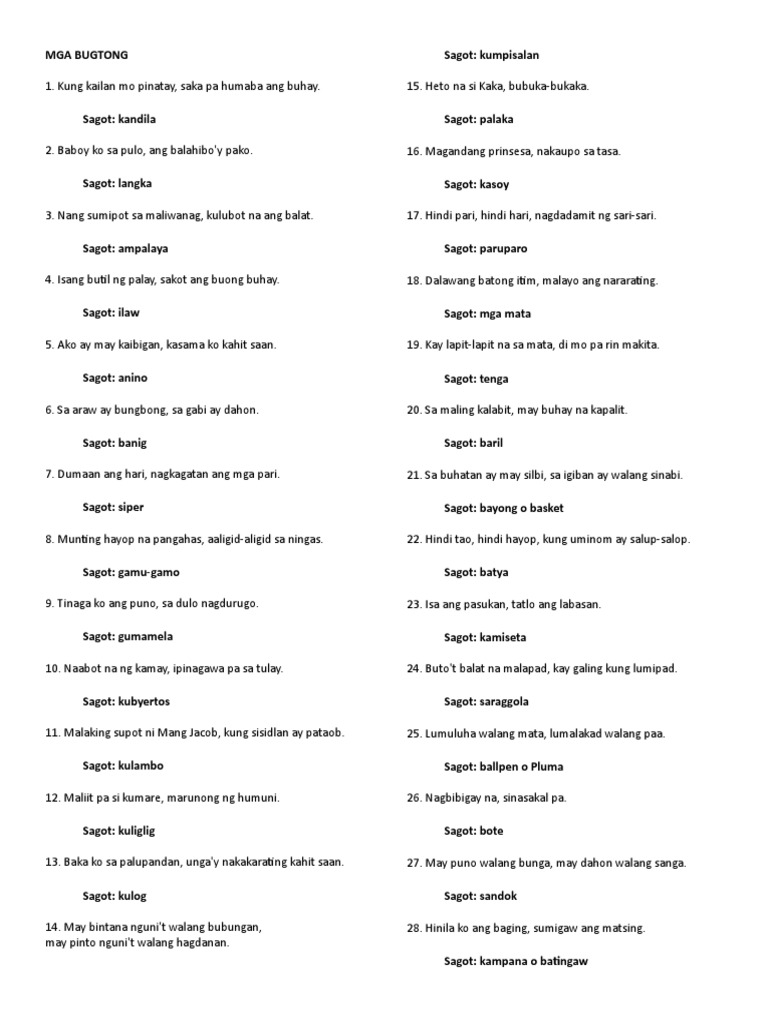 Dalawang batong itim malayo ang nararatingSagot. Dumaan ang hari nagkagatan ang mga pari. Tatlong hukom kung wala ang isay hindi makakahatol.