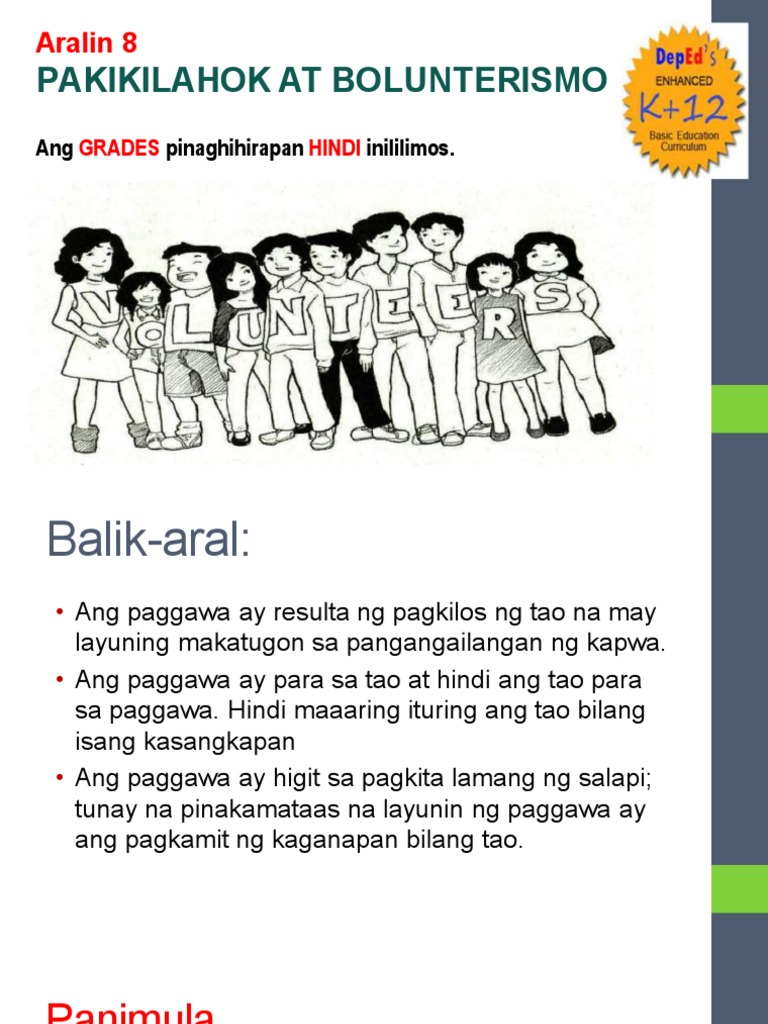 Si Jerick ay pumupunta sa bahay ampunan ng mga bata upang alagaan ang mgaito tuwing bakasyonc. Alin ang hindi halimbawa ng bolunterismo Answers. Ang pakikilahok ay isang tungkulin na kailangang isakatuparan ng lahat na mayroong kamalayan at pananagutan tungo sa kabutihang panlahat.
