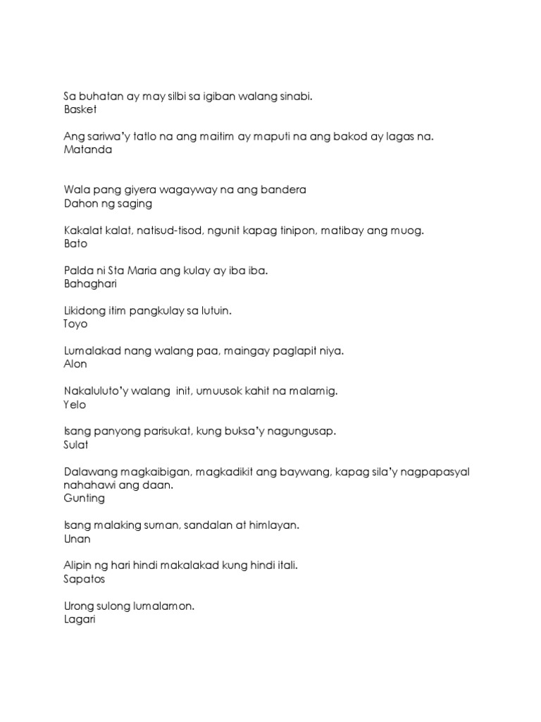 16012021 halimbawa ng palaisipan at bugtong. Escrito por el febrero 19 2021Posteado en UncategorizedUncategorized. Alipin ng hari hindi makalakad kung hindi itali.