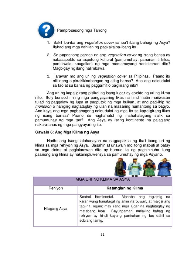 At kahit hindi pare-pareho ang kanilang relihiyon meron pa rin silang pinananaligan. Bakit hindi pare-pareho ang taglay na likas na yaman ng rehiyon sa Asya. Paano hinaharap ng mga Asyano ang pagkakaiba-iba ng taglay na likas na yaman sa bawat rehiyon sa Asya.